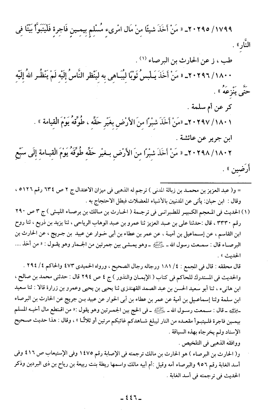 1801/ 20297 - "مَنْ أَخَذَ شِبْرًا مِنَ الأَرْضِ بِغَيرِ حَقِّهِ، طُوِّقهُ يَوْمَ الْقِيامة".