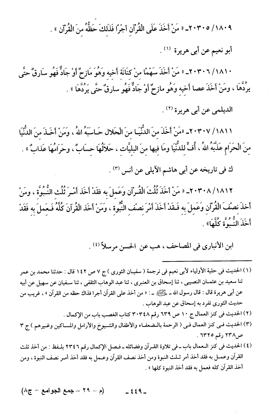 1812/ 20308 - "مَنْ أخَذَ ثُلُثَ الْقُرآن وَعَمِلَ بِه فقَدْ أَخَذ أَمْرَ ثُلُثِ النُّبُوَّةِ، ومَنْ أَخذَ نِصْفَ الْقُرآنِ وَعَمِلَ بِهِ فَقَدْ أَخَذَ أَمْرَ نِصْفِ النُّبُوةِ، وَمَنْ أَخَذ الْقُرانَ كُلَّهُ فَعَملَ بِهِ فَقَدْ أَخَذَ النُّبُوَّة كُلَّهَا".