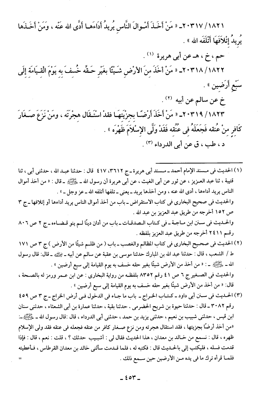 1822/ 20318 - "مَنْ أخَذَ مِنَ الأرْضِ شَيئًا بغَيرِ حَقِّه خُسِفَ بِهِ يَوْمَ الْقِيَامَةِ إِلَى سَبع أَرَضِين".