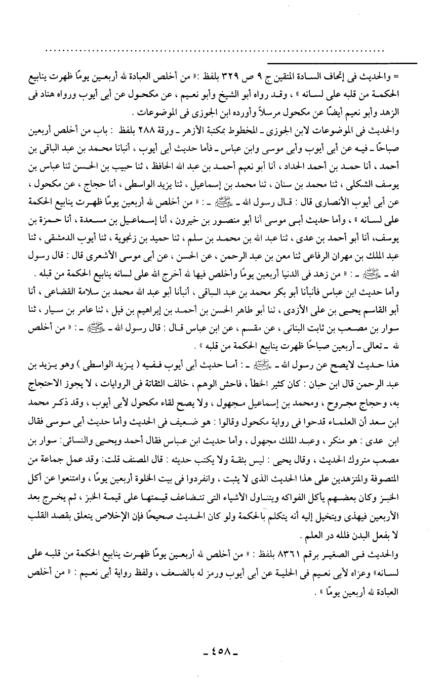 هذا حديث لا يصح عن رسول الله - صلى الله عليه وسلم -: أما حديث أبي أيوب ففيه (يزيد الواسطى) وهو يزيد بن عبد الرحمن قال ابن حبان: كان كثير الخطأ، فاحش الوهم، خالف الثقات في الروايات، لا يجوز الاحتجاج به، وحجاج مجروح، ومحمد بن إسماعيل مجهول، ولا يصح لقاء مكحول لأبي أيوب، وقد ذكر محمد بن سعد أن العلماء قدحوا في رواية مكحول وقالوا: هو ضعيف في الحديث وأما حديث أبي موسى فقال ابن عدي: هو منكر، وعبد الملك مجهول، وأما حديث ابن عباس فقال أحمد ويحيى والنسائي: سوار بن مصعب متروك الحديث، وقال يحيى: ليس بثقة ولا يكتب حديثه: قال المصنف قلت: وقد عمل جماعة من المتصوفة والمتزهدين على هذا الحديث الذي لا يثبت، وانفردوا في بيت الخلوة أربعين يومًا، وامتنعوا عن أكل الخبز وكان بعضهم يأكل الفواكه ويتناول الأشياء التي تتضاعف قيمتها على قيمة الخبز، ثم يخرج بعد الأربعين فيهذى ويتخيل إليه أنه يتكلم بالحكمة ولو كان الحديث صحيحًا فإن الإخلاص يتعلق بقصد القلب لا بفعل البدن فلله در العلم.