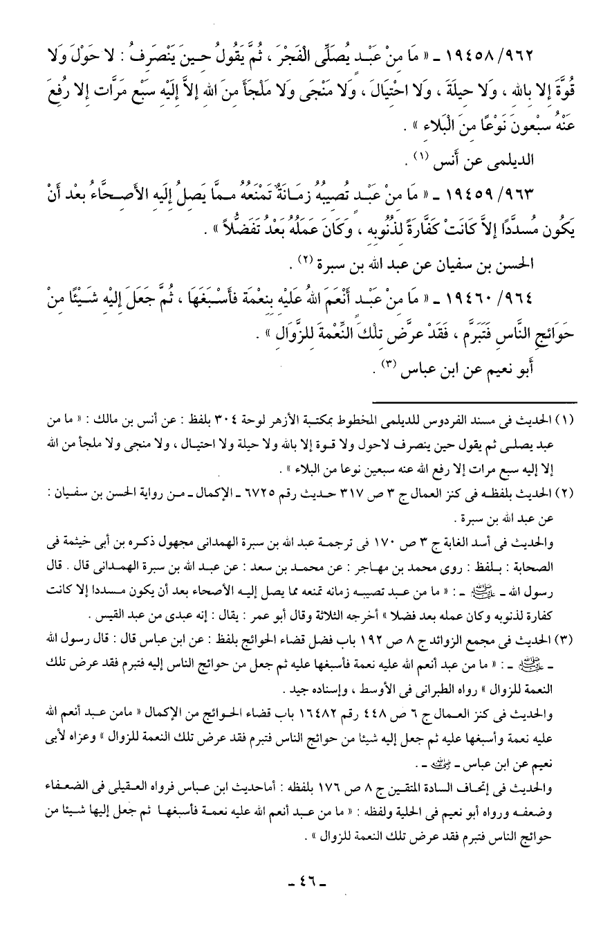 (¬1) الحديث في مسند الفردوس للديلمى المخطوط بمكتبة الأزهر لوحة 304 بلفظ: عن أنس بن مالك: "ما من عبد يصلى ثم يقول حين ينصرف لاحول ولا قوة إلا بالله ولا حيلة ولا احتيال، ولا منجى ولا ملجأ من الله إلا إليه سبع مرات إلا رفع الله عنه سبعين نوعا من البلاء".
