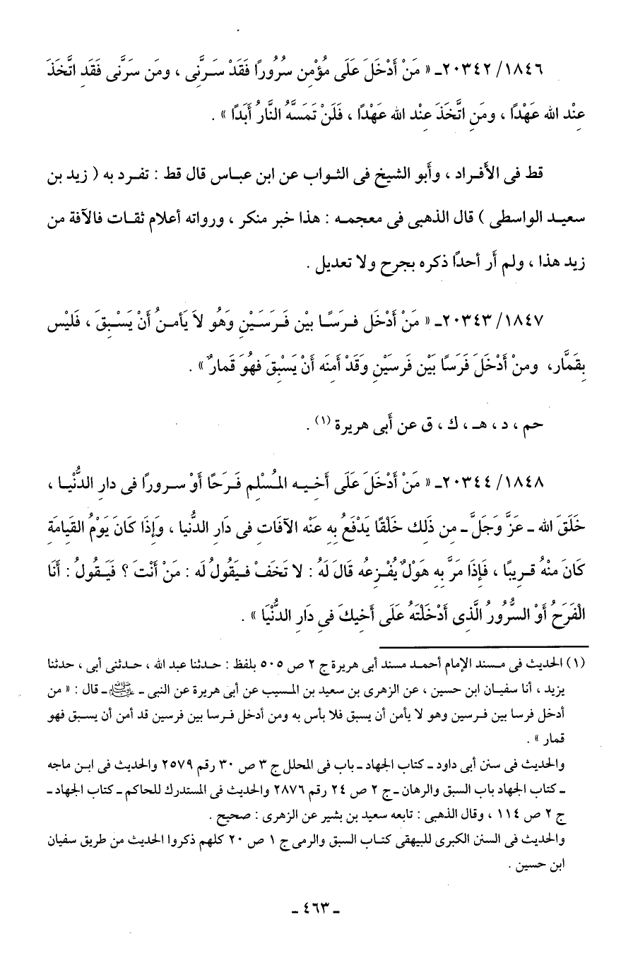 (¬1) الحديث في مسند الإمام أحمد مسند أبي هريرة ج 2 ص 505 بلفظ: حدثنا عبد الله، حدثني أبي، حدثنا يزيد، أنا سفيان بن حسين، عن الزهري بن سعيد بن المسيب عن أبي هريرة عن النبي - صلى الله عليه وسلم - قال: "من أدخل فرسا بين فرسين وهو لا يأمن أن يسبق فلا بأس به ومن أدخل فرسا بين فرسين قد أمن أن يسبق فهو قمار". والحديث في سنن أبي داود -كتاب الجهاد- باب في المحلل ج 3 ص 30 رقم 2579 والحديث في ابن ماجه - كتاب الجهاد باب السبق والرهان- ج 2 ص 24 رقم 2876 والحديث في المستدرك للحاكم- كتاب الجهاد- ج 2 ص 114، وقال الذهبي: تابعه سعيد بن بشر عن الزهري: صحيح.