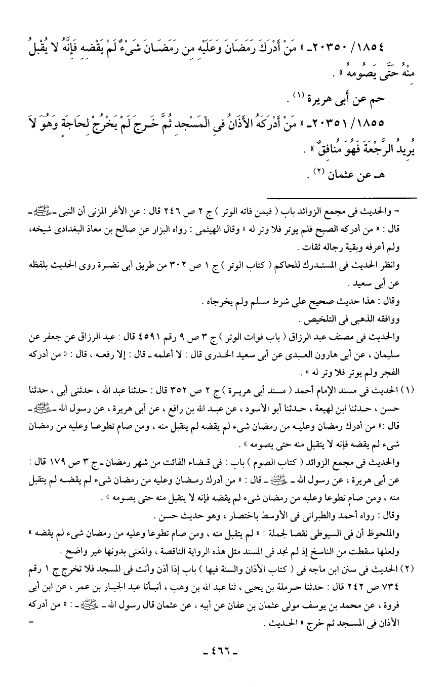 1855/ 20351 - "مَنْ أَدْرَكَهُ الأَذَانُ في الْمَسْجدِ ثُمَّ خَرجَ لَمْ يَخْرُجْ لِحَاجَةٍ وَهُوَ لَا يُرِيدُ الرَّجْعَةَ فَهُوَ مُنافِقٌ".