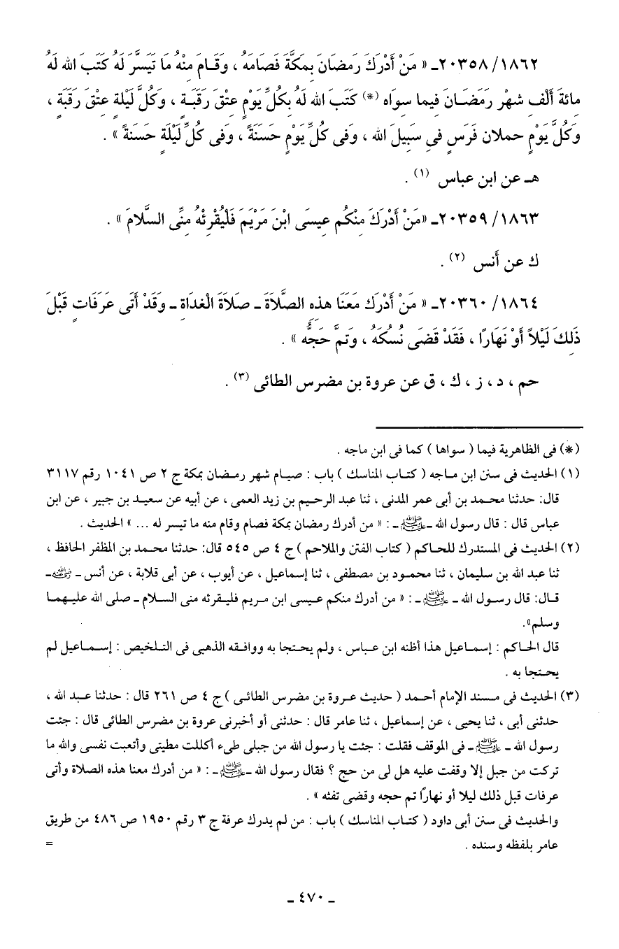 (¬3) الحديث في مسند الإمام أحمد (حديث عروة بن مضرس الطائى) ج 4 ص 261 قال: حدثنا عبد الله، حدثني أبي، ثنا يحيى، عن إسماعيل، ثنا عامر قال: حدثني أو أخبرني عروة بن مضرس الطائى قال: جئت رسول الله - صلى الله عليه وسلم - في الموقف فقلت: جئت يا رسول الله من جبلى طئ أكللت مطيتى وأتعبت نفسي والله ما تركت من جبل إلا وقفت عليه هل لي من حج؟ فقال رسول الله - صلى الله عليه وسلم -: "من أدرك معنا هذه الصلاة وأتى عرفات قبل ذلك ليلا أو نهارًا تم حجه وقضى تفثه".