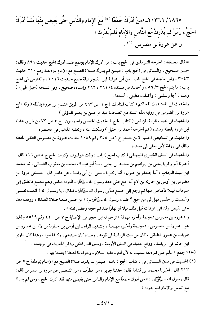 1865/ 20361 - "منْ أَدْرَكَ جَمْعًا (*) مَعَ الإِمَام والنَّاسِ حَتَّى يَفِيضَ مِنْهَا فَقَدْ أَدْرَكَ الحَجَّ، وَمَنْ لم يُدْرِكْ مَع النَّاسِ والإِمَام فَلمْ يُدْرِك".