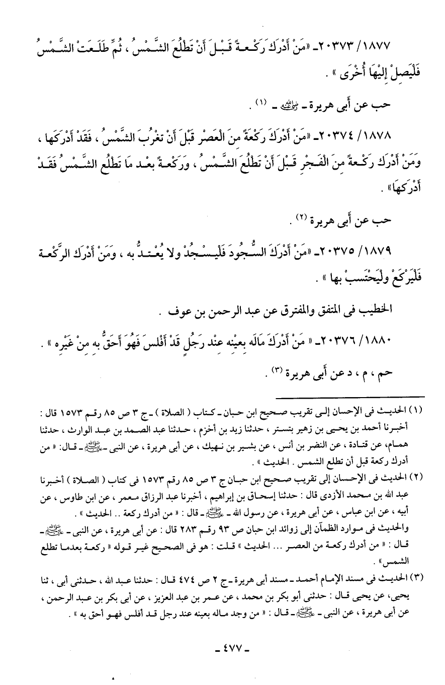 1877/ 20373 - "مَنْ أَدْرَكَ رَكْعةً قَبْلَ أَنْ تَطْلُعَ الشَّمْسُ، ثُمَّ طَلَعَتْ الشَّمْسُ فَلْيَصِلْ إِليهَا أُخْرَى".