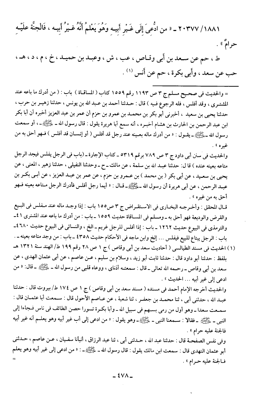 (¬1) الحديث في مسند الطيالسى (أحاديث سعد بن أبي وقاص) ج 1 ص 28 رقم 199 ط الهند سنة 1321 هـ بلفظ: حدثنا أبو داود قال: حدثنا ثابت أبو زيد، وسلام بن سليم، عن عاصم، عن أبي عثمان الهدى، عن سعد بن أبي وقاص -رحمه الله تعالى- قال: سمعته أذناى، ووعاه قلبى من رسول الله - صلى الله عليه وسلم - قال: "من ادعى إلى غير أبيه ... الحديث".