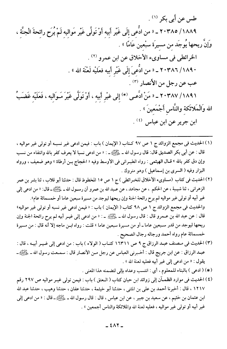 (¬3) الحديث في مصنف عبد الرزاق ج 9 ص 16311 كتاب (الولاء) باب: من ادعى إلى غير أبيه، قال: عبد الرزاق: عن ابن جريج قال: أخبرني العباس عن رجل من الأنصار قال: سمعت رسول الله - صلى الله عليه وسلم - يقول: "من ادعى إلى غير أبيه فعليه لعنة الله".