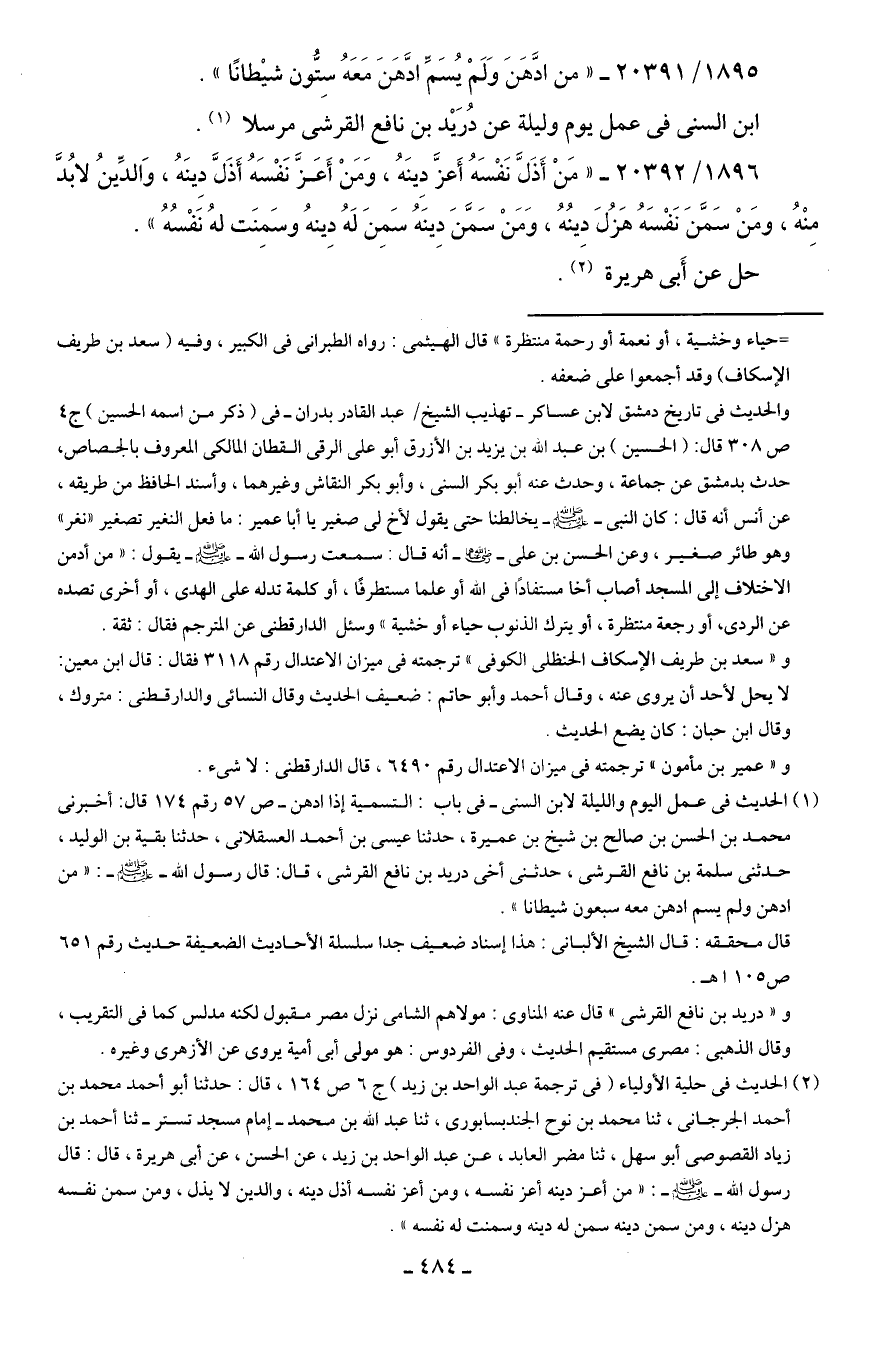 1896/ 20392 - "مَنْ أَذَلَّ نَفْسَهُ أَعزَّ دِينَهُ، وَمَنْ أَعَزَّ نَفْسَهُ أَذَلَّ دِينَهُ، وَالدِّينُ لابُدَّ مِنْهُ، ومَنْ سَمَّنَ نَفْسَهُ هَزُلَ دِينُهُ، وَمَنْ سَمَّنَ دِينَهُ سَمِنَ لَهُ دِينهُ وسَمِنَت لهُ نَفْسُهُ".