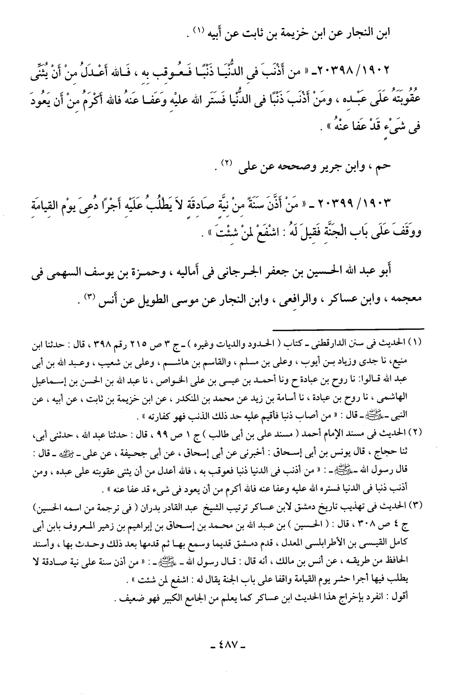 (¬1) الحديث في سنن الدارقطني- كتاب (الحدود والديات وغيره) - ج 3 ص 215 رقم 398، قال: حدثنا ابن منيع، نا جدى وزياد بن أيوب، وعلي بن مسلم، والقاسم بن هاشم، وعلي بن شعيب، وعبد الله بن أبي عبد الله قالوا: نا روح بن عبادة ح ونا أحمد بن عيسى بن علي الخواص، نا عبد الله بن الحسن بن إسماعيل الهاشمي، نا روح بن عبادة، نا أسامة بن زيد عن محمد بن المنكدر، عن ابن خزيمة بن ثابت، عن أبيه، عن النبي - صلى الله عليه وسلم - قال: "من أصاب ذنبا فأقيم عليه حد ذلك الذنب فهو كفارته".