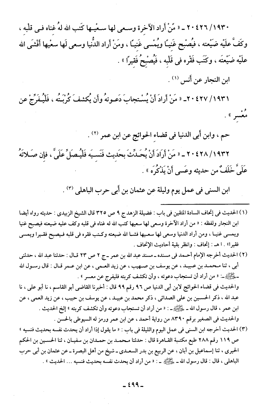 (¬1) الحديث في إتحاف السادة المتقين في باب: فضيلة الزهد ج 9 ص 325 قال الشيخ الزبيدي: حديثه رواه أيضًا ابن النجار ولفظه: "من أراد الآخرة وسعى لها سعيها كتب الله له غناه في قلبه وكف عليه ضيعته فيصبح غنيا ويمسى غنيا، ومن أراد الدنيا وسعى لها سعيها فشا الله ضيعته وكتب فقره في قلبه فيصبح فقيرا ويمسى فقيرا". أهـ: إتحاف: وانظر بقية أحاديث الإتحاف.