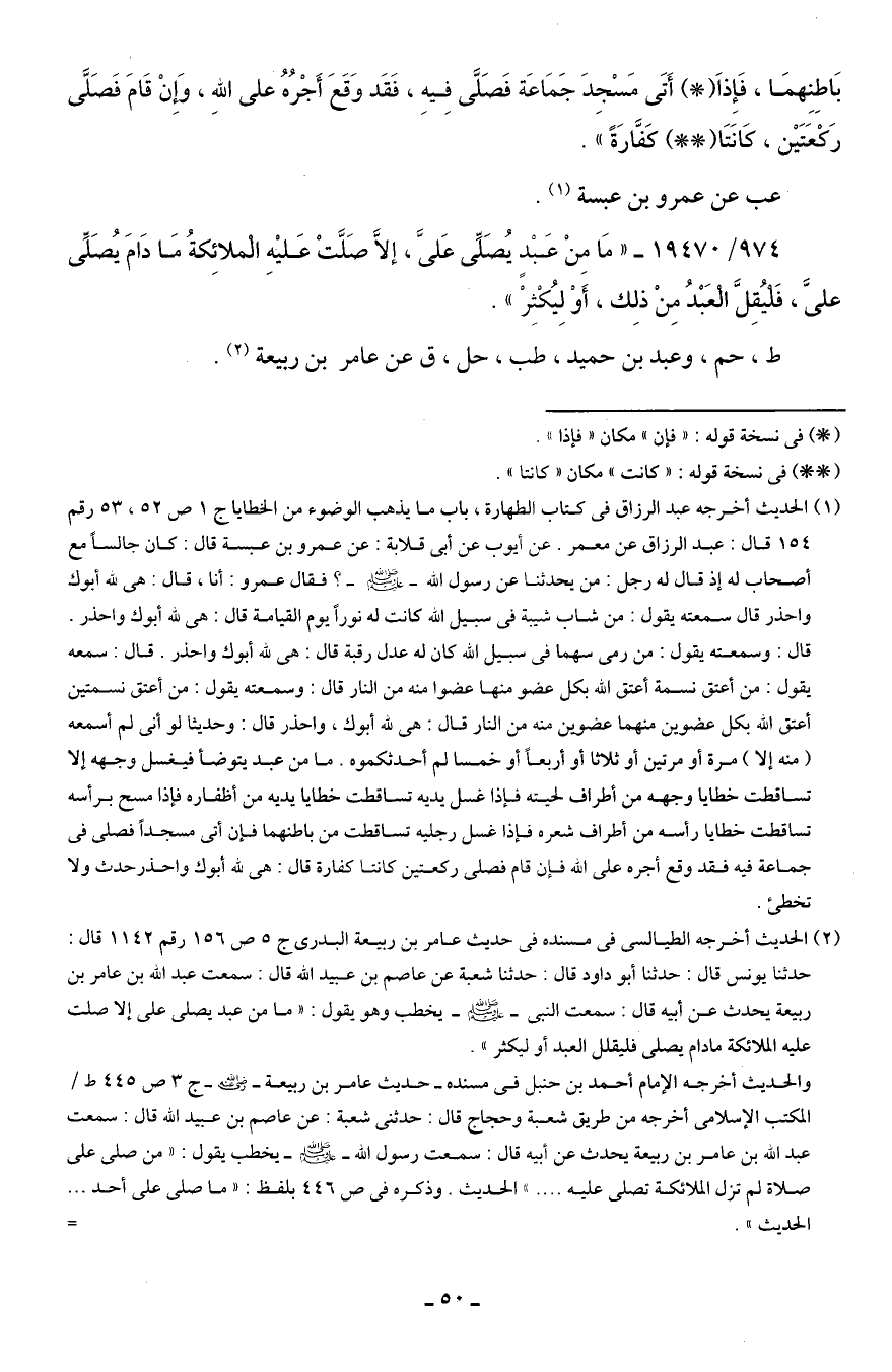 (¬1) الحديث أخرجه عبد الرزاق في كتاب الطهارة، باب ما يذهب الوضوء من الخطايا ج 1 ص 52، 53 رقم 154 قال: عبد الرزاق عن معمر. عن أيوب عن أبي قلابة: عن عمرو بن عبسة قال: كان جالسًا مع أصحاب له إذ قال له رجل: من يحدثنا عن رسول الله - صلى الله عليه وسلم -؟ فقال عمرو: أنا، قال: هي لله أبوك واحذر قال سمعته يقول: من شاب شيبة في سبيل الله كانت له نورًا يوم القيامة قال: هي لله أبوك واحذر. قال: وسمعته يقول: من رمى سهما في سبيل الله كان له عدل رقبة قال: هي لله أبوك واحذر. قال: سمعه يقول: من أعتق نسمة أعتق الله بكل عضو منها عضوا منه من النار قال: وسمعته يقول: من أعتق نسمتين أعتق الله بكل عضوين منهما عضوين منه من النار قال: هي لله أبوك، واحذر قال: وحديثا لو أنى لم أسمعه (منه إلا) مرة أو مرتين أو ثلاثا أو أربعًا أو خمسا لم أحدثكموه. ما من عبد يتوضأ فيغسل وجهه إلا تساقطت خطايا وجهه من أطراف لحيته فإذا غسل يديه تساقطت خطايا يديه من أظفاره فإذا مسح برأسه تساقطت خطايا رأسه من أطراف شعره فإذا غسل رجليه تساقطت من باطنهما فإن أتى مسجدًا فصلى في جماعة فيه فقد وقع أجره على الله فإن قام فصلى ركعتين كانتا كفارة قال هي لله أبوك واحذر حدث ولا تخطئ.