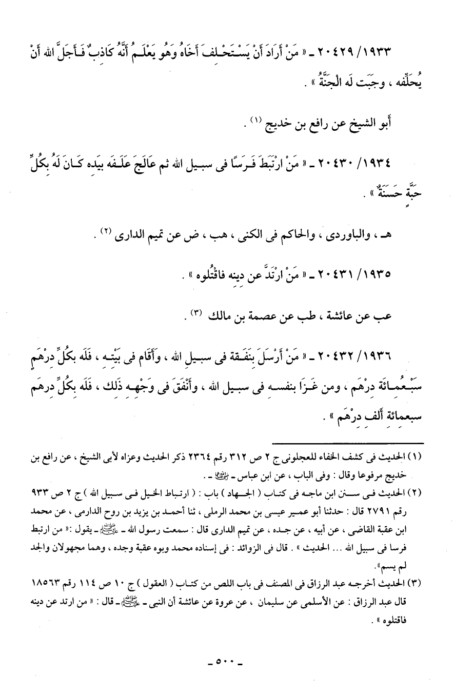 1933/ 20429 - "مَنْ أَرَادَ أَنْ يَسْتَحْلِفَ أَخَاهُ وَهُو يَعْلَمُ أَنَّهُ كَاذِبٌ فَأَجَلَّ الله أَنْ يُحَلِّفه، وجَبَت لَه الْجَنَّةُ".