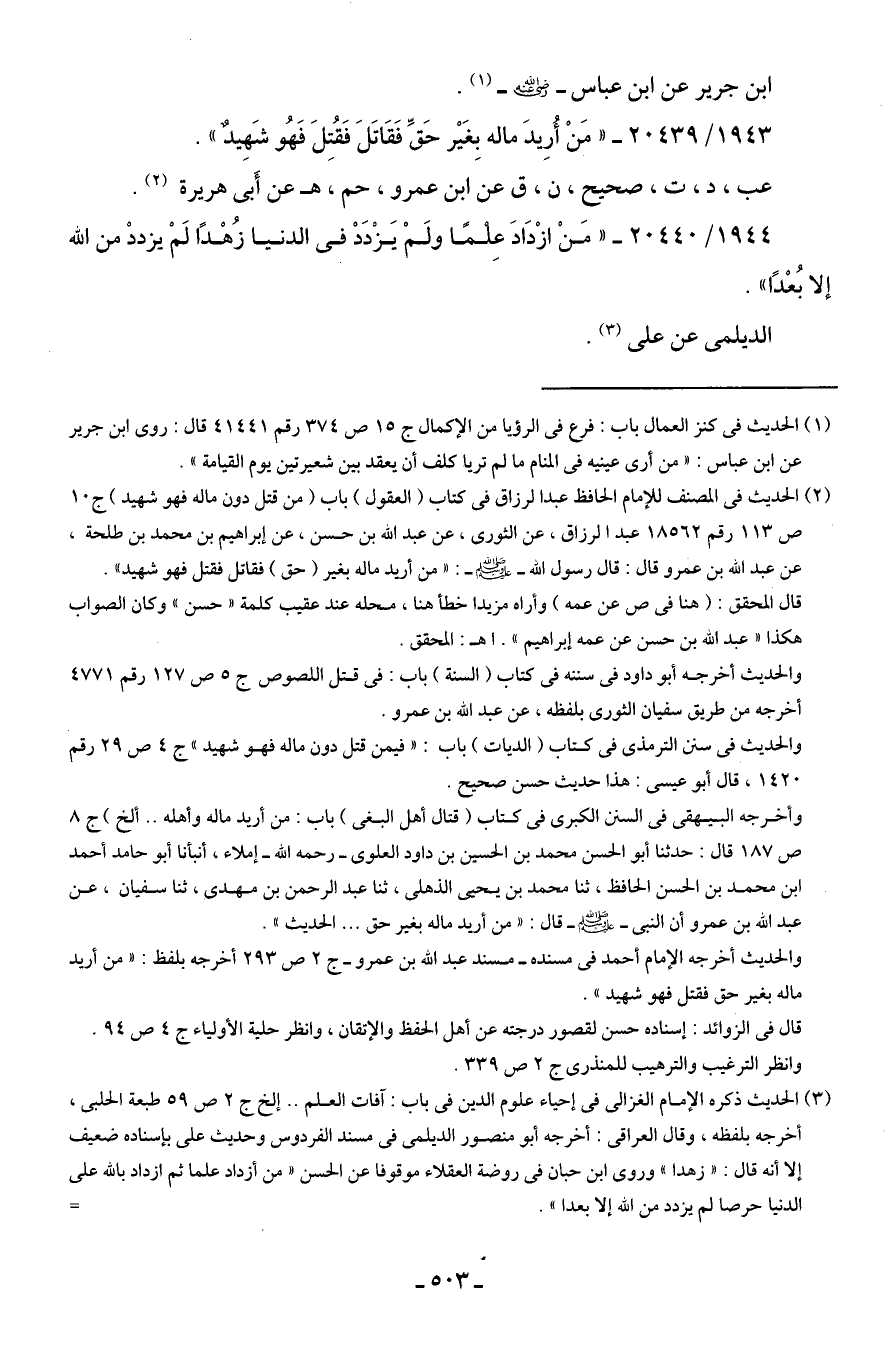 1943/ 20439 - "مَنْ أُرِيدَ ماله بِغَير حَقٍّ فَقَاتَلَ فَقُتِلَ فَهُو شَهِيدٌ".