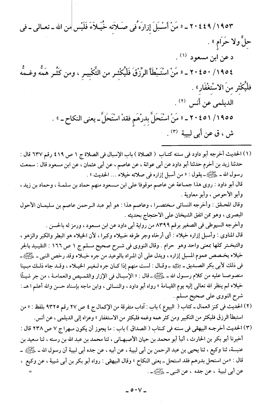 (¬1) الحديث أخرجه أبو داود في سننه كتاب (الصلاة) باب الإسبال في الصلاة ج 1 ع 419 رقم 637 قال: حدثنا زيد بن آخرم حدثنا أبو داود عن أبي عوانة، عن عاصم، عن أبي عثمان، عن ابن مسعود قال: سمعت رسول الله - صلى الله عليه وسلم - يقول: "من أسبل إزاره في صلاته خيلاء ... الحديث".