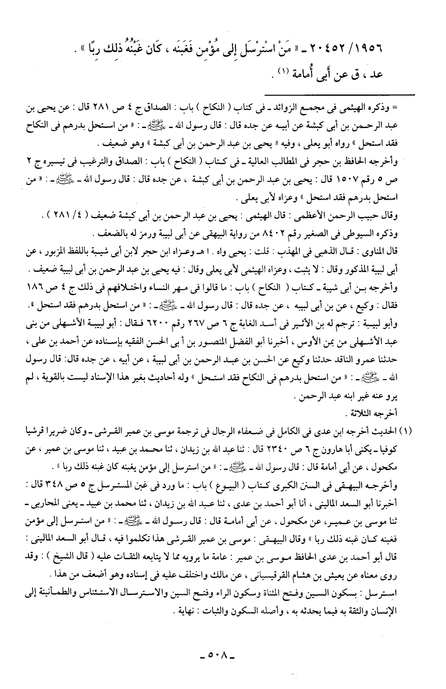 وأخرجه الحافظ بن حجر في المطالب العالية- في كتاب (النكاح) باب: الصداق والترغيب في تيسيره ج 2 ص 5 رقم 1507 قال: يحيى بن عبد الرحمن بن أبي كبشة، عن جده قال: قال رسول الله - صلى الله عليه وسلم -: "من استحل بدرهم فقد استحل" وعزاه لأبي يعلى.