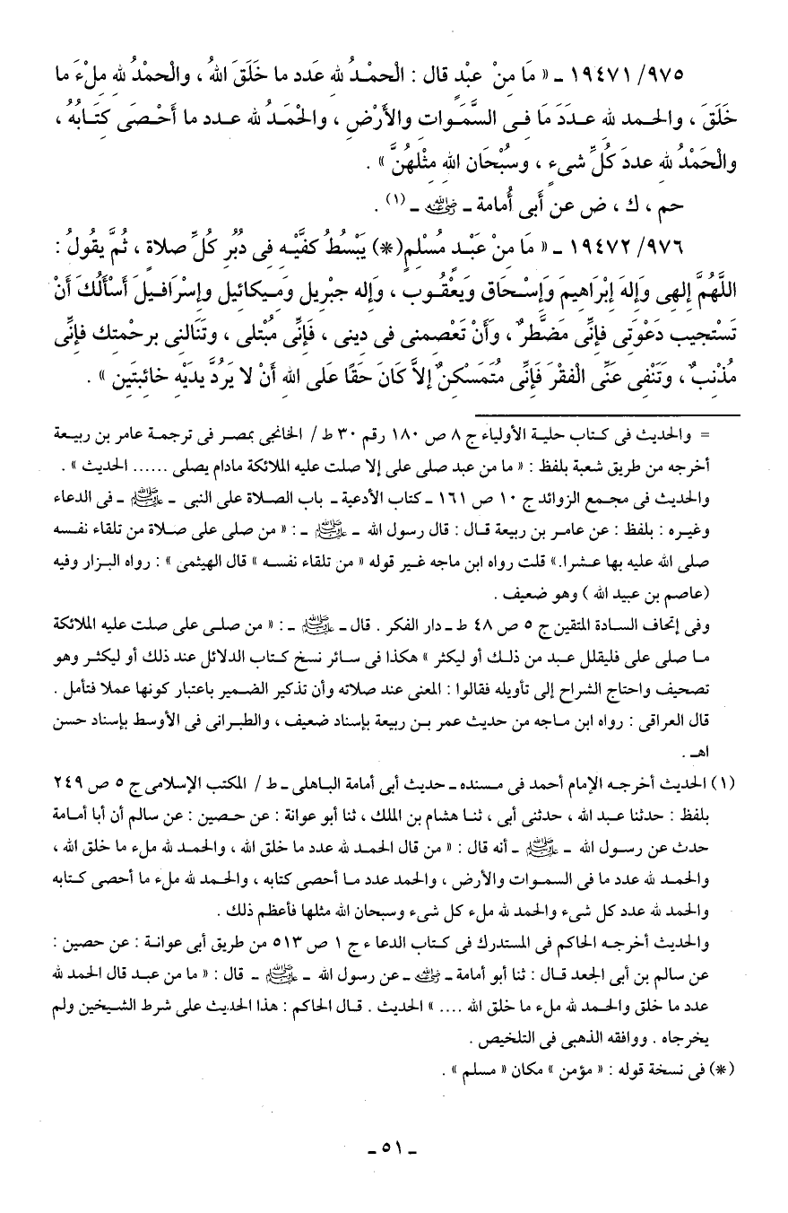 (¬1) الحديث أخرجه الإمام أحمد في مسنده- حديث أبي أمامة الباهلى- ط / المكتب الإسلامي ج 5 ص 249 بلفظ: حدثنا عبد الله، حدثني أبي، ثنا هشام بن الملك، ثنا أبو عوانة: عن حصين: عن سالم أن أبا أمامة حدث عن رسول الله - صلى الله عليه وسلم - أنه قال: "من قال الحمد لله عدد ما خلق الله، والحمد لله ملء ما خلق الله، والحمد لله عدد ما في السموات والأرض، والحمد عدد ما أحصى كتابه، والحمد لله ملء ما أحصى كتابه والحمد لله عدد كل شيء والحمد لله ملء كل شيء وسبحان الله مثلها فأعظم ذلك.