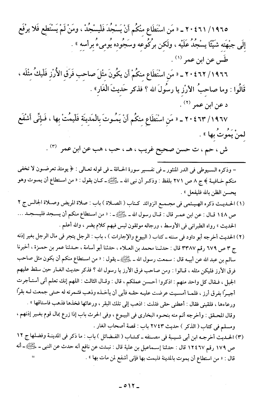 1967/ 20463 - "مَنِ اسْتَطَاعِ مِنكُم أَنْ يَمُوتَ بِالْمَدِينَةِ فَلْيمُتْ بِها، فَإِنِّى أَشْفَع لِمنْ يَمُوتُ بِها".