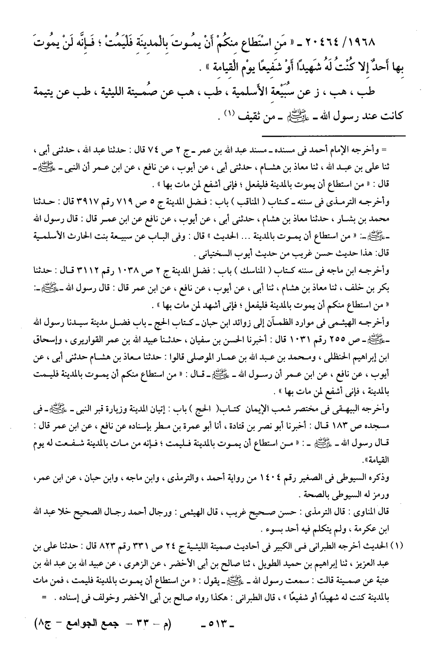 1968/ 20464 - "مَنِ اسْتَطاع منكُمْ أَنْ يمُوتَ بِالْمدِينَةِ فَليَمُتْ، فَإِنَّه لَنْ يمُوتَ بِها أَحدٌ إِلا كُنْتُ لَهُ شَهيدًا أَوْ شَفِيعًا يوْم الْقِيامِة".