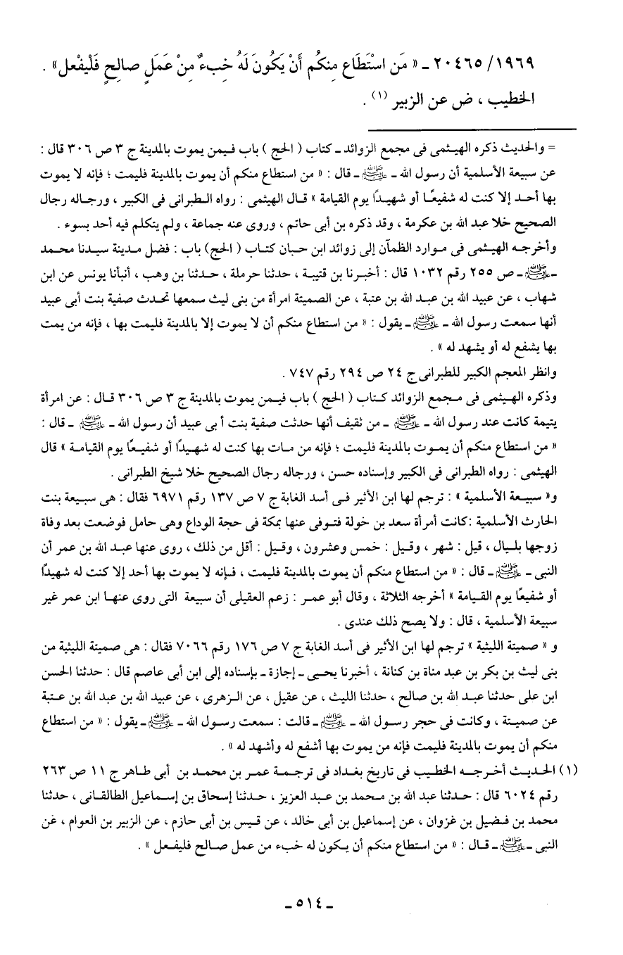 وذكره الهيثمي في مجمع الزوائد كتاب (الحج) باب فيمن يموت بالمدينة ج 3 ص 306 قال: عن امرأة يتيمة كانت عند رسول الله - صلى الله عليه وسلم - من ثقيف أنها حدثت صفية بنت أبي عبيد أن رسول الله - صلى الله عليه وسلم - قال: "من استطاع منكم أن يموت بالمدينة فليمت؛ فإنه من مات بها كنت له شهيدًا أو شفيعًا يوم القيامة" قال الهيثمي: رواه الطبراني في الكبير وإسناده حسن، ورجاله رجال الصحيح خلا شيخ الطبراني.