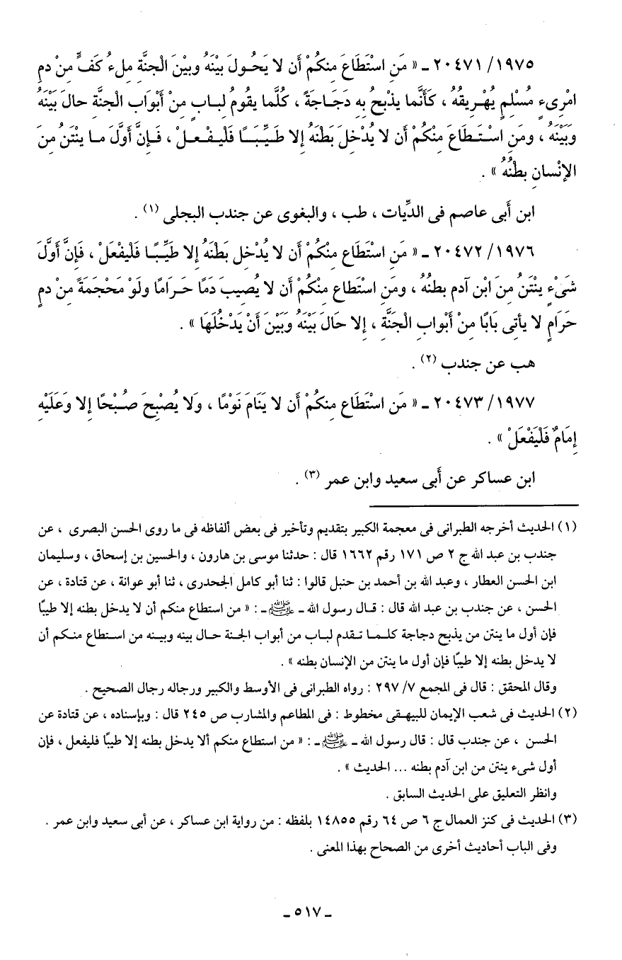 1975/ 20471 - "مَنِ اسْتَطَاعَ مِنكُمْ أَن لا يَحُولَ بينَهُ وبينَ الْجنَّةِ مِلءُ كَفٍّ مِنْ دمِ امْرِئٍ مُسْلِمٍ يُهْرِيقُهُ، كَأَنَّما يذْبحُ بِهِ دَجَاجَةً، كلَّما يقُومُ لباب مِنْ أَبْوَاب الْجنَّةِ حال بَينَهُ وَبَينَهُ، ومَنِ اسْتَطَاعَ مِنْكُمْ أَن لا يُدْخِلَ بَطْنَهُ إِلا طَيِّبًا فَلْيفْعلْ، فَإِنَّ أَوَّلَ ما ينْتَنُ مِنَ الإنْسانِ بطْنُهُ".