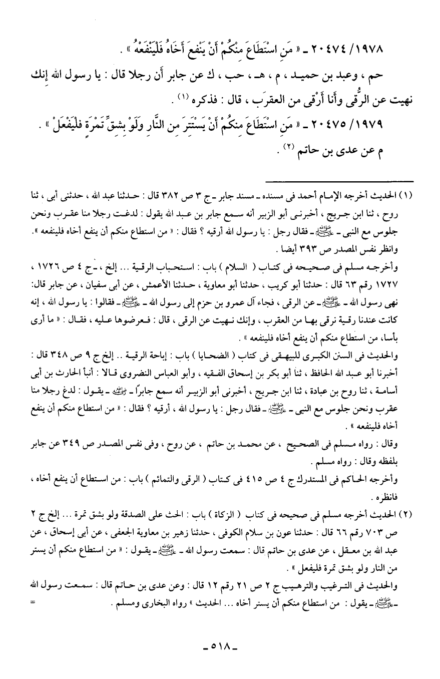 (¬1) الحديث أخرجه الإمام أحمد في مسنده -مسند جابر- ج 3 ص 382 قال: حدثنا عبد الله، حدثني أبي، ثنا روح، ثنا ابن جريج، أخبرني أبو الزبير أنه سمع جابر بن عبد الله يقول: لدغت رجلا ما عقرب ونحن جلوس مع النبي - صلى الله عليه وسلم - فقال رجل: يا رسول الله أرقيه؟ فقال: "من استطاع منكم أن ينفع أخاه فلينفعه".