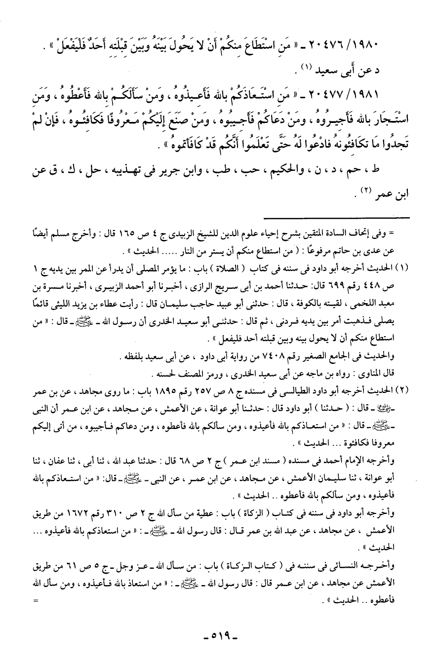 1981/ 20477 - "مَنِ اسْتَعَاذَكُمْ بالله فَأَعِيذُوهُ، وَمنْ سَأَلَكُمْ بِالله فَأَعْطُوهُ، وَمَنِ اسْتَجَارَ بالله فَأَجِيرُوهُ، ومَنْ دَعَاكُمْ فَأَجِيبُوهُ، وَمنْ صَنَعَ إِلَيكُمْ مَعْرُوفًا فَكَافِئُوهُ، فَإنْ لمْ تَجدُوا مَا تكَافِئُونهُ فادْعُوا لَهُ حَتَّى تَعْلَمُوا أَنَّكُم قَدْ كَافَأتموهُ".