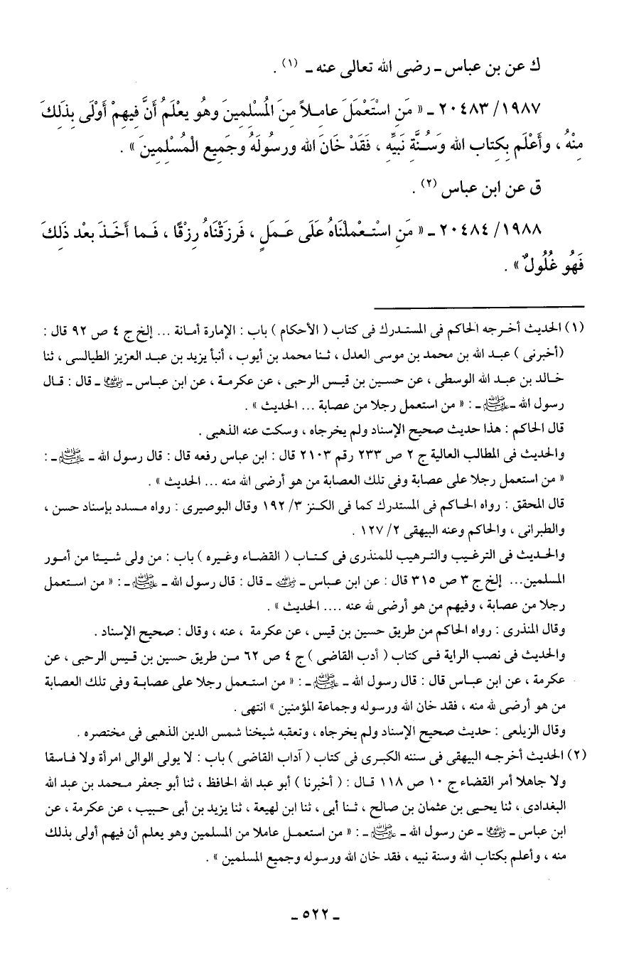 (¬2) الحديث أخرجه البيهقي في سننه الكبرى في كتاب (آداب القاضي) باب: لا يولى الوالى امرأة ولا فاسقا ولا جاهلا أمر القضاء ج 10 ص 118 قال: (أخبرنا) أبو عبد الله الحافظ، ثنا أبو جعفر محمد بن عبد الله البغدادي، ثنا يحيى بن عثمان بن صالح، ثنا أبي، ثنا ابن لهيعة، ثنا يزيد بن أبي حبيب، عن عكرمة، عن ابن عباس - رضي الله عنهما - عن رسول الله - صلى الله عليه وسلم -: "من استعمل عاملا من المسلمين وهو يعلم أن فيهم أولى بذلك منه، وأعلم بكتاب الله وسنة نبيه، فقد خان الله ورسوله وجميع المسلمين".