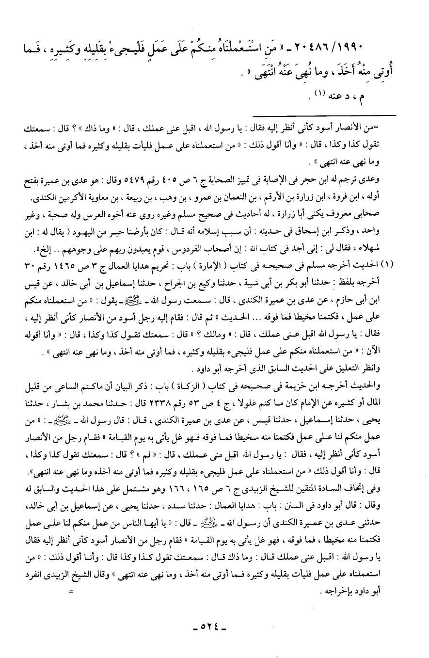 1990/ 20486 - "مَنِ اسْتَعْملنَاهُ مِنكُمْ عَلَى عَمَلٍ فَليجئْ بِقَلِيلِهِ وكَثِيرِهِ، فَما أُوتِى مِنْهُ أَخَذَ، وما نُهِيَ عَنْهُ انْتَهَى".