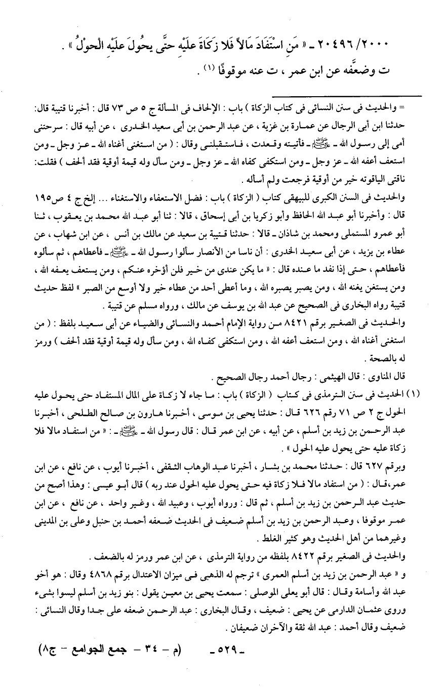 وبرقم 627 قال: حدثنا محمد بن بشار، أخبرنا عبد الوهاب الثقفى، أخبرنا أيوب، عن نافع، عن ابن عمر، قال: (من استفاد مالا فلا زكاة فيه حتى يحول عليه الحول عند ربه) قال أبو عيسى: وهذا أصح من حديث عبد الرحمن بن زيد بن أسلم، ثم قال: ورواه أيوب، وعبيد الله، وغير واحد، عن نافع، عن ابن عمر موقوفًا، وعبد الرحمن بن زيد بن أسلم ضعيف في الحديث ضعفه أحمد بن حنبل وعلي بن المديني وغيرهما من أهل الحديث وهو كثير الغلط.