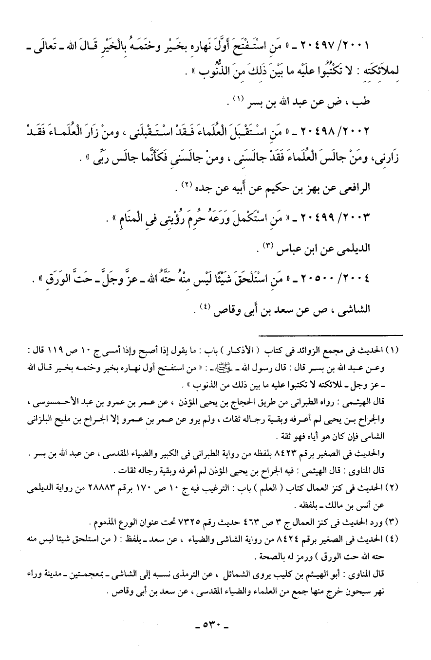 2001/ 20497 - "مَنِ اسْتَفْتَحَ أَوَّلَ نَهارهِ بخَير وختَمَهُ بِالْخَيرِ قَال الله -تَعالى- لِملائِكَتِهِ: لا تَكْتُبُوا علَيه ما بَينَ ذَلِكَ مِنَ الذُّنُوب".
