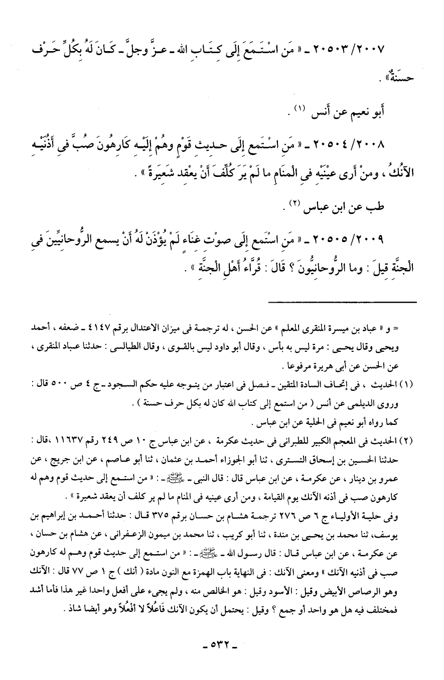 2009/ 20505 - "مَنِ اسْتَمع إِلَى صوْتِ غِنَاءٍ لَمْ يُؤْذَنْ لَهُ أَنْ يسمع الرُّوحانِيِّينَ في الْجنَّةِ قِيلَ: وما الرُّوحانِيُّونَ؟ قَال: قُرَّاءُ أَهْلِ الْجنَّةِ".