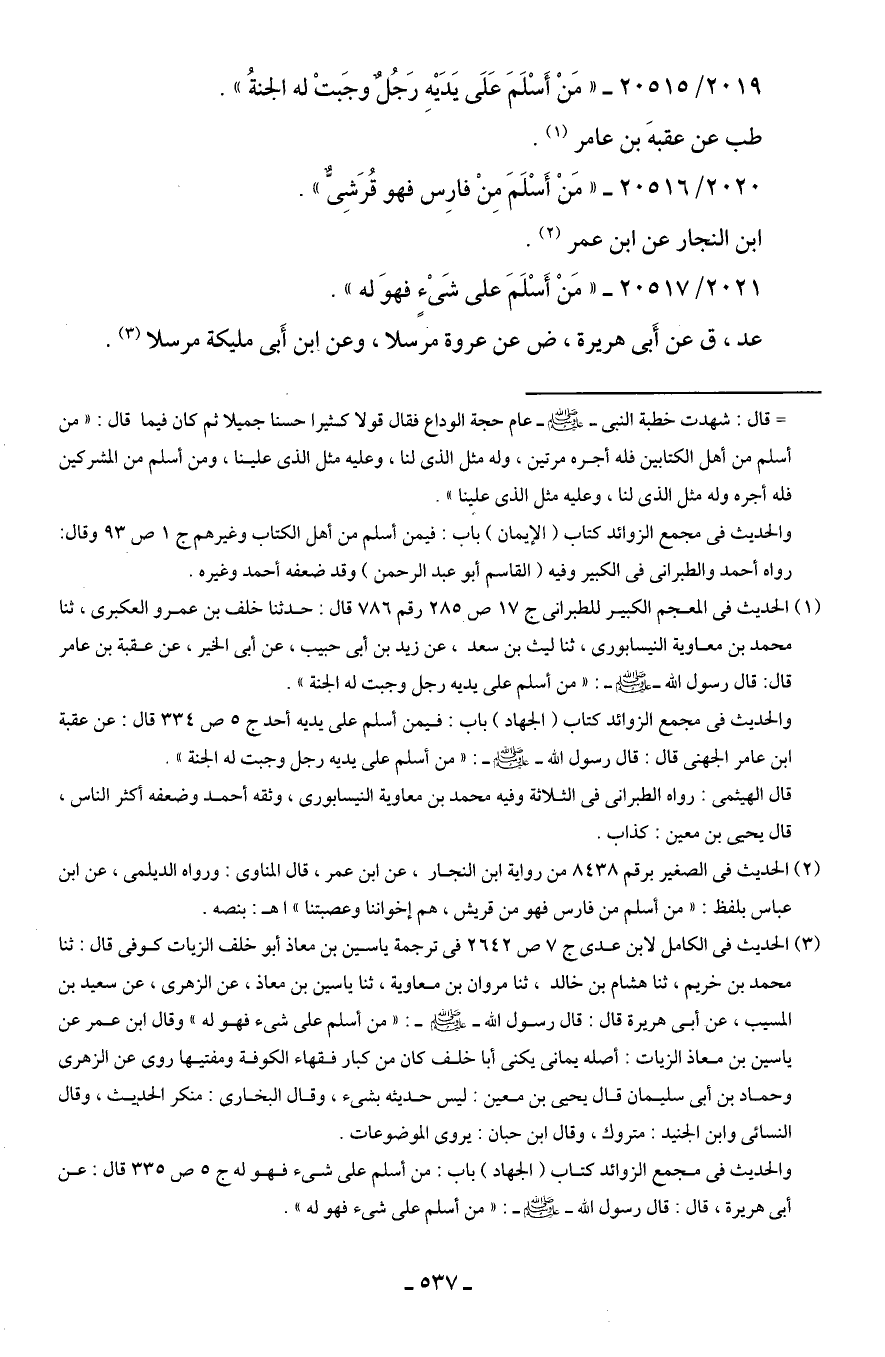 2019/ 20515 - "مَنْ أَسْلَمَ عَلَى يَدَيهِ رَجُلٌ وجَبتْ له الجنةُ".