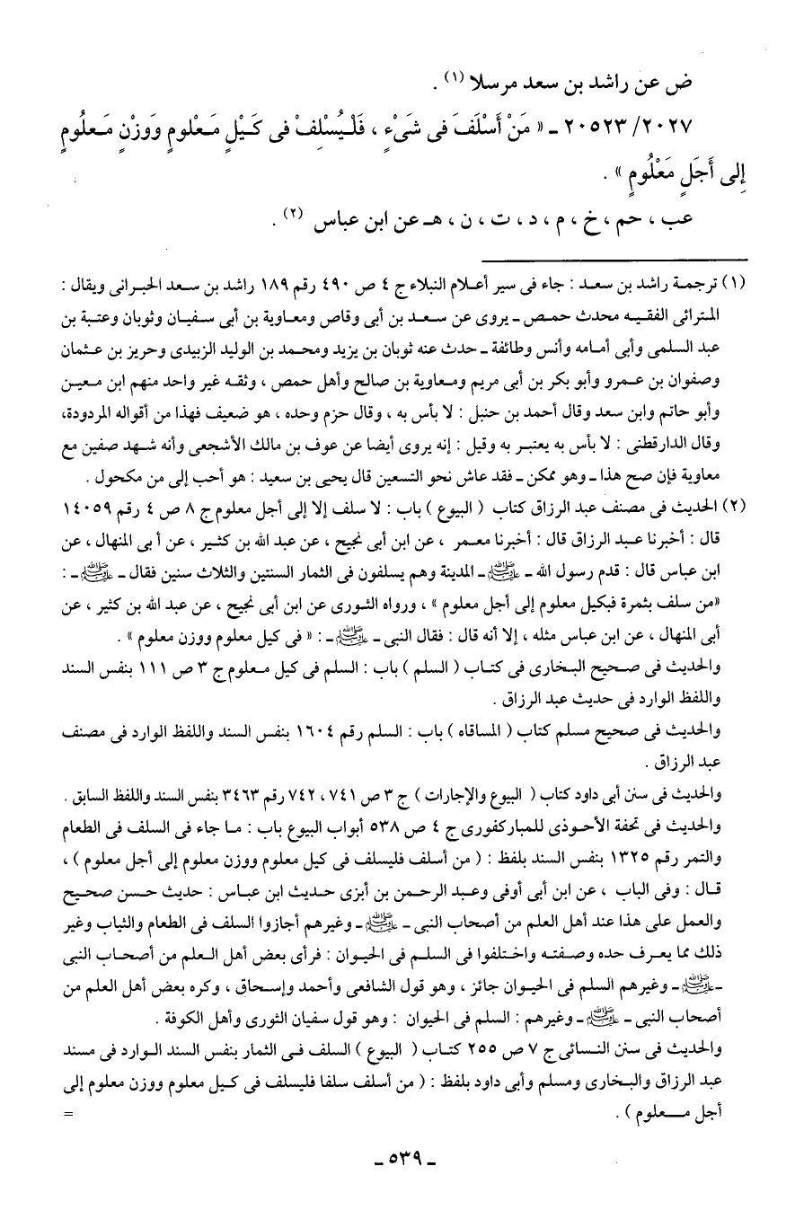 2027/ 20523 - "مَنْ أَسْلَفَ في شَيْءٍ، فَليُسْلِفْ في كَيلٍ مَعْلومٍ وَوزْنِ مَعلُومٍ إِلى أَجَلٍ مَعْلُومٍ".