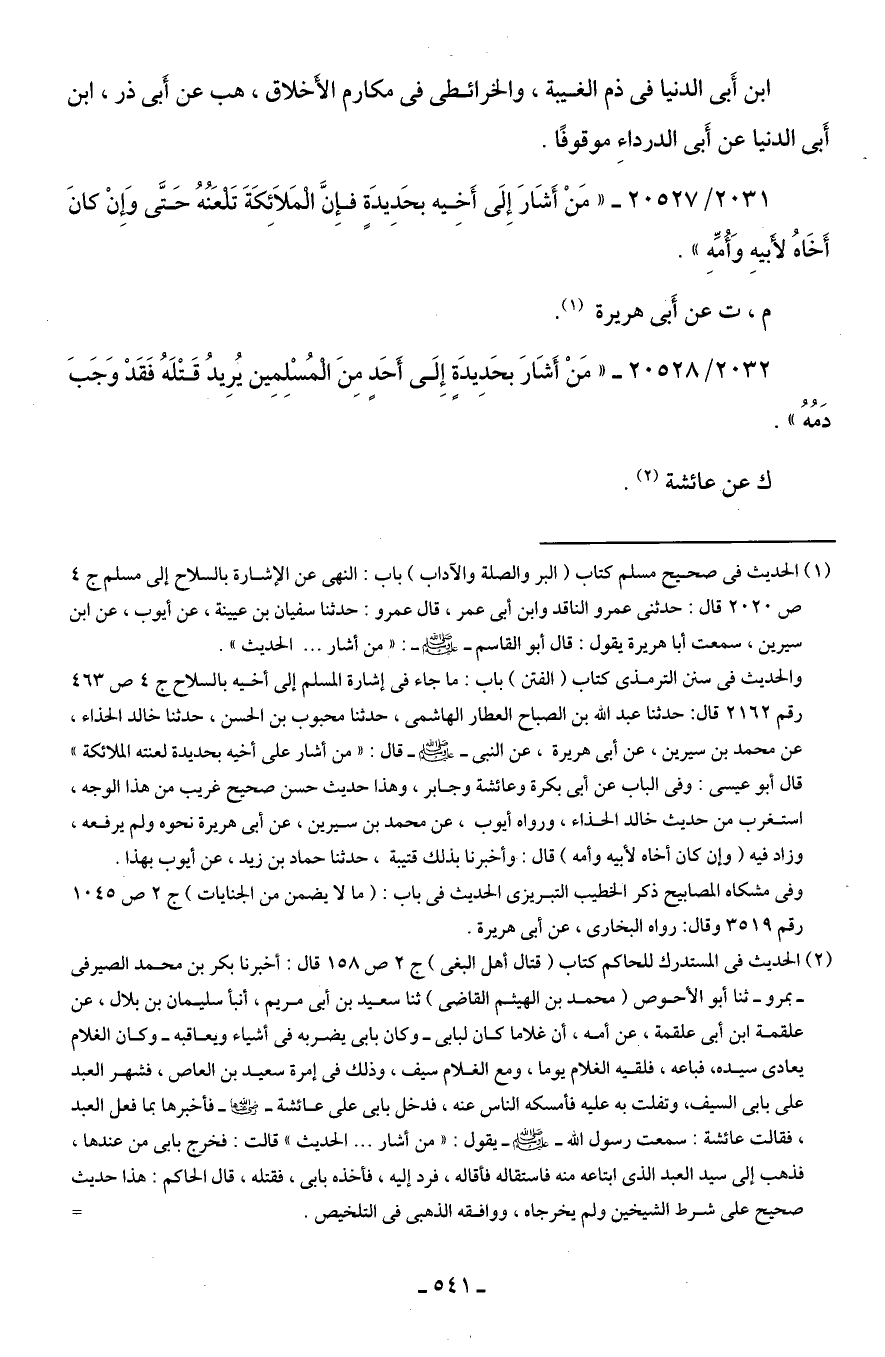 2031/ 20527 - "مَنْ أَشَارَ إِلَى أَخِيه بحَدِيدَةٍ فإِنَّ الْمَلائِكَةَ تَلعَنُهُ حَتَّى وَإِنْ كانَ أَخَاهُ لأبيهِ وَأُمِّهِ".