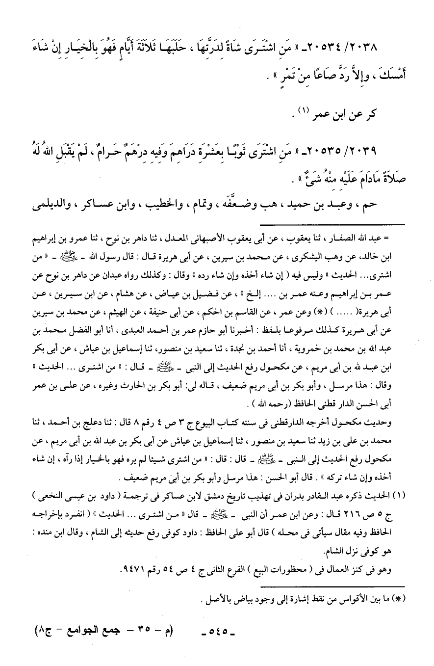 (¬1) الحديث ذكره عبد القادر بدران في تهذيب تاريخ دمشق لابن عساكر في ترجمة (داود بن عيسى النخعي) ج 5 ص 216 قال: وعن ابن عمر أن النبي - صلى الله عليه وسلم - قال "من اشترى ... الحديث" (انفرد بإخراجه الحافظ وفيه مقال سيأتي في محله) قال أبو على الحافظ: داود كوفي رفع حديثه إلى الشام، وقال ابن منده: هو كوفي نزل الشام.