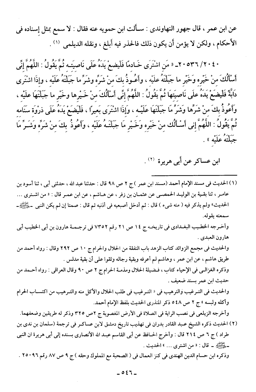 2040/ 20536 - "مَنِ اشْتَرَى خَادِمًا فَليضعْ يَدَهُ عَلَى نَاصيَته ثمَّ يَقُولُ: اللَّهُمَّ إِنِّي أَسْأَلُكَ مِنْ خَيرِهِ وَخَيرِ ما جَبَلتَهُ علَيهِ، وأَعُوذُ بكَ مِنْ شَرِّهِ وشَرِّ ما جَبَلْتَهُ عَلَيهِ، وإِذَا اشْتَرى دَابَّةً فَليضَعْ يَدَهُ علَى نَاصِيَتهَا ثُمَّ يَقُولُ: اللَّهُمَّ إِنِّي أَسْأَلُكَ مِنْ خَيرِها وخَيرِ ما جَبَلتَهَا علَيهِ، وَأَعُوذُ بِكَ مِنْ شَرِّها وَشَرِّ مَا جَبَلتَهَا عَلَيهِ، وَإِذَا اشْتَرَى بَعِيرًا، فَليَضَعْ يَدَهُ عَلَى ذرْوَةِ سَنَامِهِ ثُمَّ يَقُولُ: اللَّهُمَّ إِنِّي أَسْأَلُك مِنْ خَيرِهِ وَخَيرِ مَا جَبَلتَهُ عَلَيهِ، وَأَعُوذُ بِكَ مِنْ شَرِّهِ وَشَرِّ مَا جَبَلتَهُ عَلَيهِ".