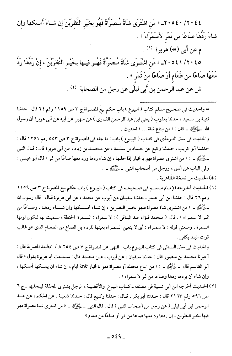 2044/ 20540 - "مَنِ اشْتَرَى شَاةً مُصَرَّاةً فَهُو بخَيرِ النَّظِرَينَ إِنْ شاءَ أَمسكها وإِن شاءَ رَدَّهَا صَاعًا من تَمْرٍ لَا سَمْرَاءَ".
