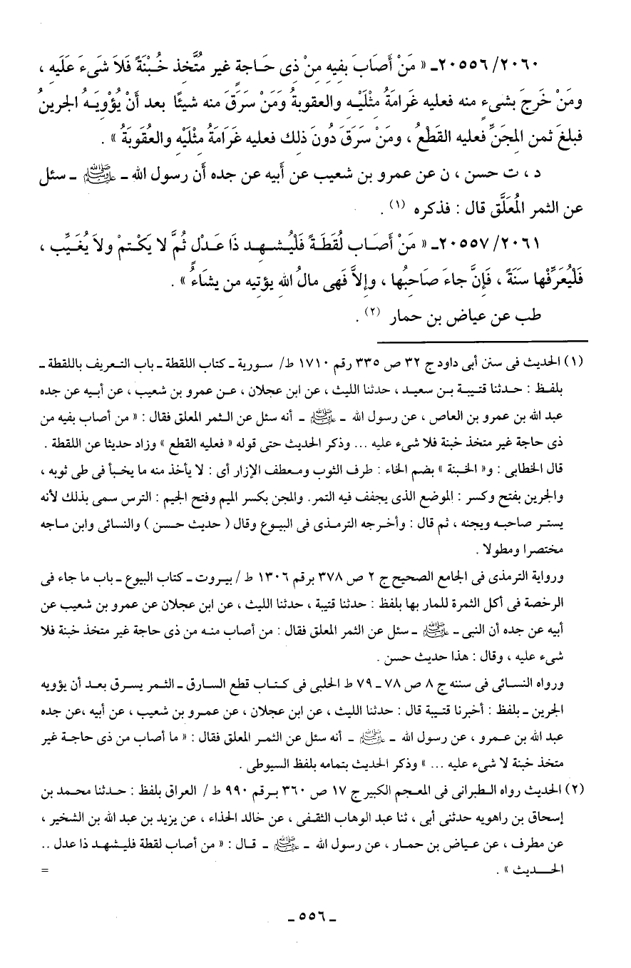 (¬1) الحديث في سنن أبي داود ج 32 ص 335 رقم 1710 ط / سورية - كتاب اللقطة - باب التعريف باللقطة - بلفظ: حدثنا قتيبة بن سعيد، حدثنا الليث، عن ابن عجلان، عن عمرو بن شعيب، عن أبيه عن جده عبد الله بن عمرو بن العاص، عن رسول الله - صلى الله عليه وسلم - أنه سئل عن الثمر المعلق فقال: "من أصاب بفيه من ذي حاجة غير متخذ خبنة فلا شيء عليه ... وذكر الحديث حتى قوله "فعليه القطع" وزاد حديثًا عن اللقطة.