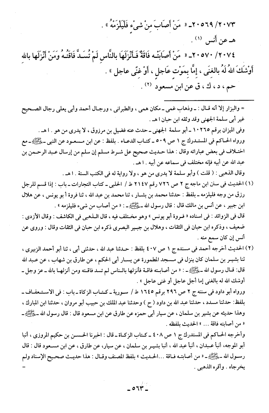 2074/ 20570 - "مَنْ أَصَابَتْه فَاقَةٌ فَأَنْزَلَهَا بالنَّاسِ لَمْ تُسَدَّ فَاقَتُهُ وَمَنْ أَنْزَلَها باللهِ أوْشَكَ اللهُ لَهُ بالغِنَى، إِمَّا بِمَوْتٍ عَاجلٍ، أَوْ غِنًى عاجل".