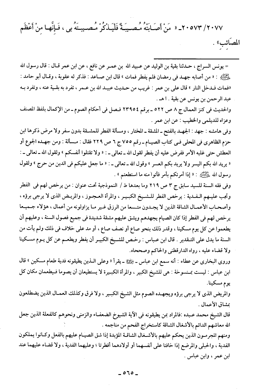 وفي هامشه: جهد: الجهد بالفتح - المشقة - المختار، ومسألة الفطر للمشقة بدون سفر ولا مرض ذكرها ابن حزم الظاهرى في المحلى في كتاب الصيام- رقم 755 ج 6 ص 229 فقال: مسألة: ومن جهده الجوع أو العطش حتى غلبه الأمر ففرض عليه أن يفطر لقول الله -تعالى-: {وَلَا تَقْتُلُوا أَنْفُسَكُمْ} ولقول الله -تعالى-: {يُرِيدُ اللَّهُ بِكُمُ الْيُسْرَ وَلَا يُرِيدُ بِكُمُ الْعُسْرَ} وقول الله -تعالى-: {وَمَا جَعَلَ عَلَيكُمْ فِي الدِّينِ مِنْ حَرَجٍ} ولقول رسول الله - صلى الله عليه وسلم -: "إذا أمرتكم بأمر فأتوا منه ما استطعتم".