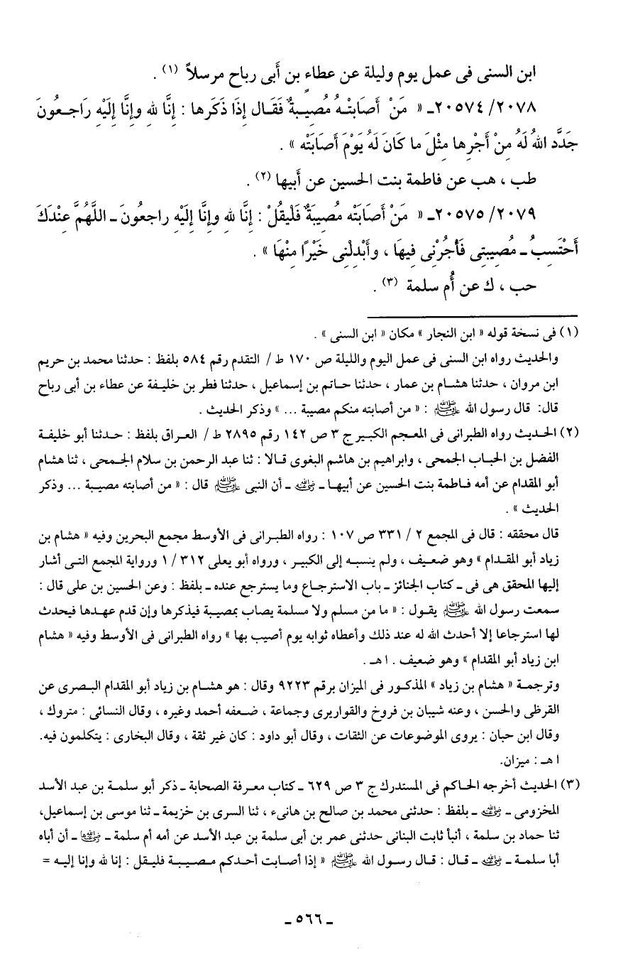 2078/ 20574 - "مَنْ أَصَابتْهُ مُصِيبةٌ فَقَال إِذَا ذَكَرها: إِنَّا للهِ وإِنَّا إِلَيهِ رَاجعُونَ جَدَّد اللهُ لَهُ مِنْ أَجْرِها مِثْلَ ما كَانَ لَهُ يَوْمَ أَصَابَتْه".