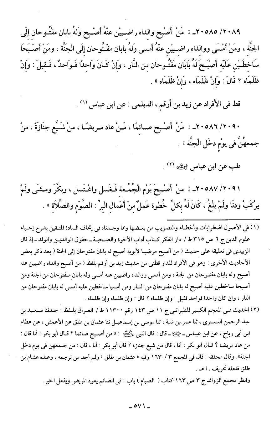 (¬1) في الأصول اضطرابات وأخطاء والتصويب من بعضها ومما وجدناه في إتحاف السادة المتقين بشرح إحياء علوم الدين ج 6 ص 315 ط / دار الفكر كتاب آداب الأخوة والصحبة - حقوق الوالدين والولد - إذ قال الزبيدي في تعليقه على حديث (من أصبح مرضيا لأبويه أصبح له بابان مفتوحان إلى الجنة (بعد ذكر بعض الأحاديث الأخرى: وهو في الأفراد للدارقطنى من حديث زيد بن أرقم بلفظ (من أصبح والداه راضيين عنه أصبح وله بابان مفتوحان من الجنة، ومن أمسى ووالداه راضيين عنه أمسى وله بابان مفتوحان من الجنة ومن أصبحا ساخطين عليه أصبح له بابان مفتوحان من النار ومن أمسيا ساخطين عليه أمسى له بابان مفتوحان من النار، وإن كان واحدا فواحد فقيل: وإن ظلماه؟ قال: وإن ظلماه وإن ظلماه.