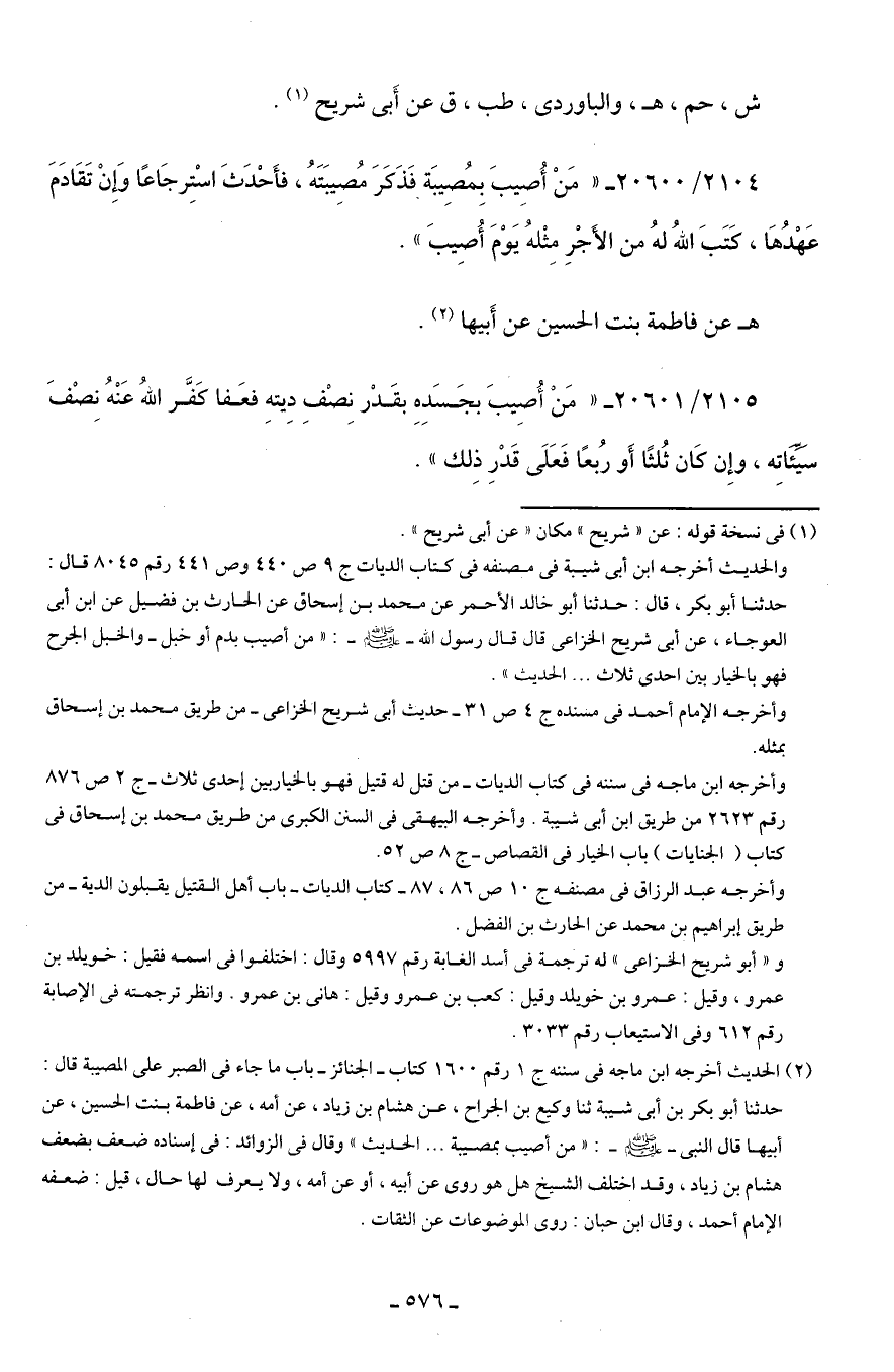 2105/ 20601 - "مَن أُصِيبَ بجَسَدِهِ بقَدْر نِصْفِ دِيتهِ فعَفا كَفَّر اللهُ عَنْهُ نِصْفَ سَيِّئَاتِه، وإِن كَان ثُلثًا أَو رُبعًا فَعَلَى قَدْرِ ذِلك".