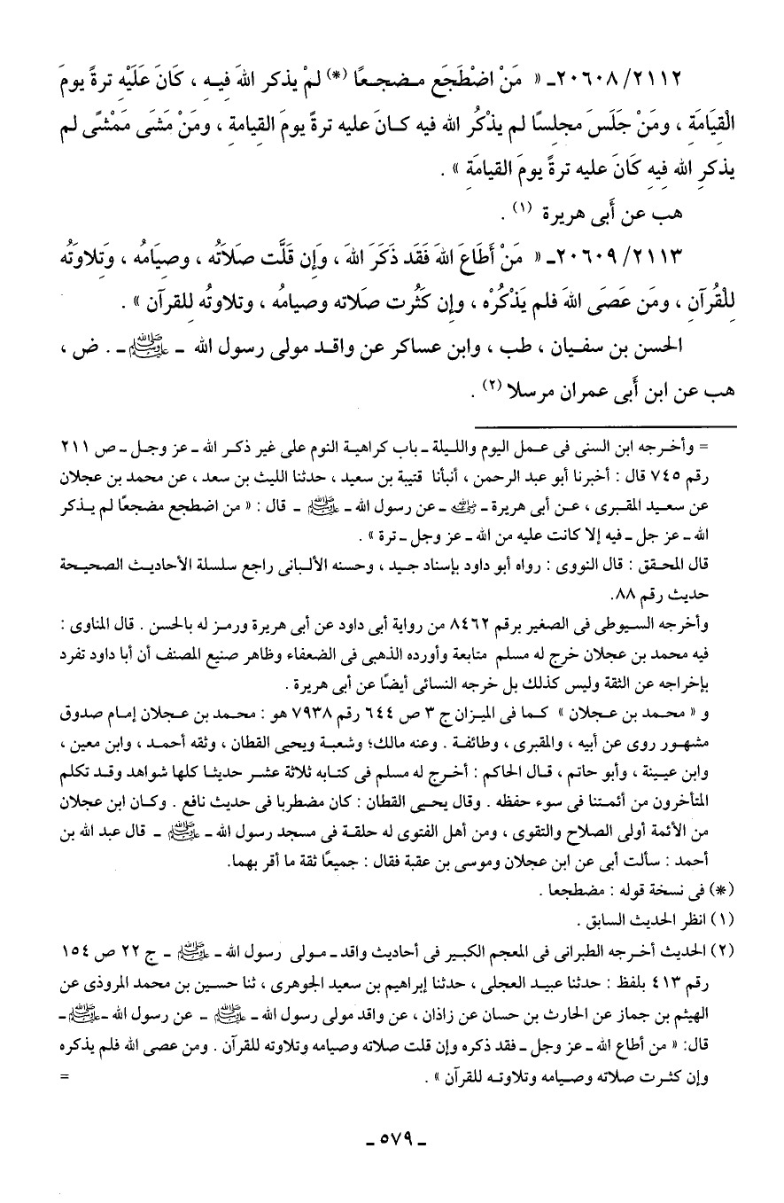 2112/ 20608 - "مَنْ اضْطَجَع مضجعًا (*) لمْ يذكر اللهَ فِيهِ، كَانَ عَلَيهِ ترةً يومَ الْقِيَامَةِ، ومَنْ جَلَسَ مجلِسًا لم يذْكُر الله فيه كَانَ عليه ترةً يومَ القِيامةِ، ومَنْ مَشَى مَمْشًى لم يذكرِ الله فِيهِ كَانَ عليه ترةً يومَ القيامَةِ".