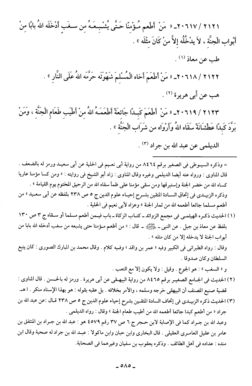 (¬3) الحديث ذكره الزبيدي في إتحاف السادة المتقين بشرح إحياء علوم الدين ج 5 ص 238 قال: عن عبد الله بن جراد "من أطعم كبدا جائعا أطعمه الله من أطيب طعام الجنة" وقال: رواه الديلمي.