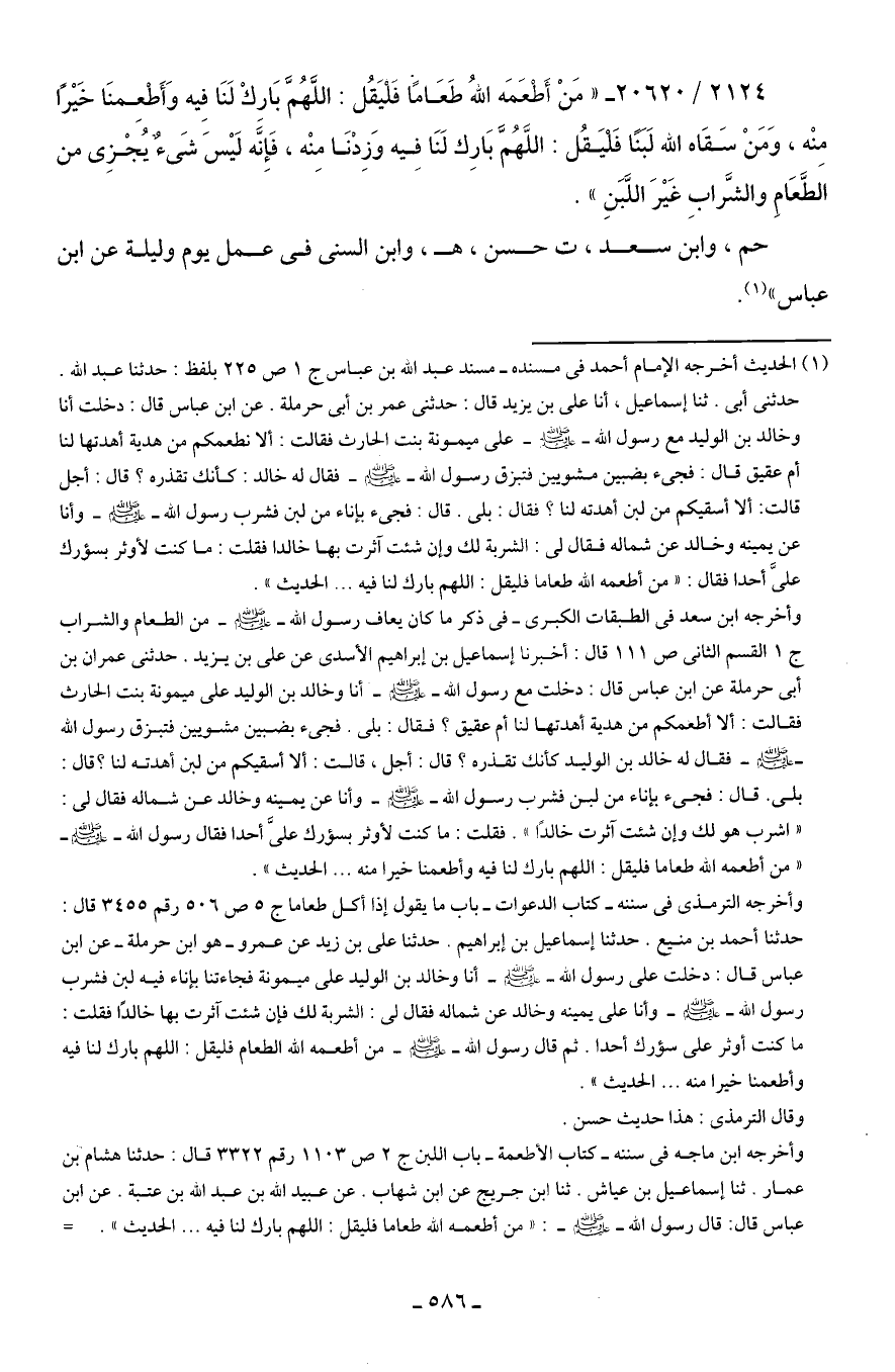 2124/ 20620 - "مَنْ أَطْعَمَه اللهُ طَعَامًا فَلْيَقُل: اللَّهُمَّ بَارِكْ لَنَا فِيه وَأَطْعِمنَا خَيرًا مِنْه، وَمَنْ سَقَاه الله لَبنًا فَليَقُل: اللَّهُمَّ بَارِك لَنَا فِيه وَزِدْنَا مِنْه، فَإِنَّه لَيسَ شَيءٌ ويُجْزِى من الطَّعَامِ والشَّرابِ غَيرَ اللَّبَنِ".