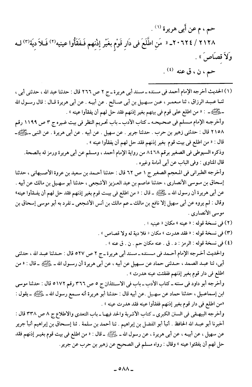 (¬1) الحديث أخرجه الإمام أحمد في مسنده -مسند أبي هريرة- ج 2 ص 266 قال: حدثنا عبد الله، حدثني أبي، ثنا عبد الرزاق، ثنا معمر، عن سهيل بن أبي صالح. عن أبيه. عن أبي هريرة قال: قال رسول الله - صلى الله عليه وسلم -: "من اطلع على قوم في بيتهم بغير إذنهم فقد حل لهم أن يفقأوا عينه".