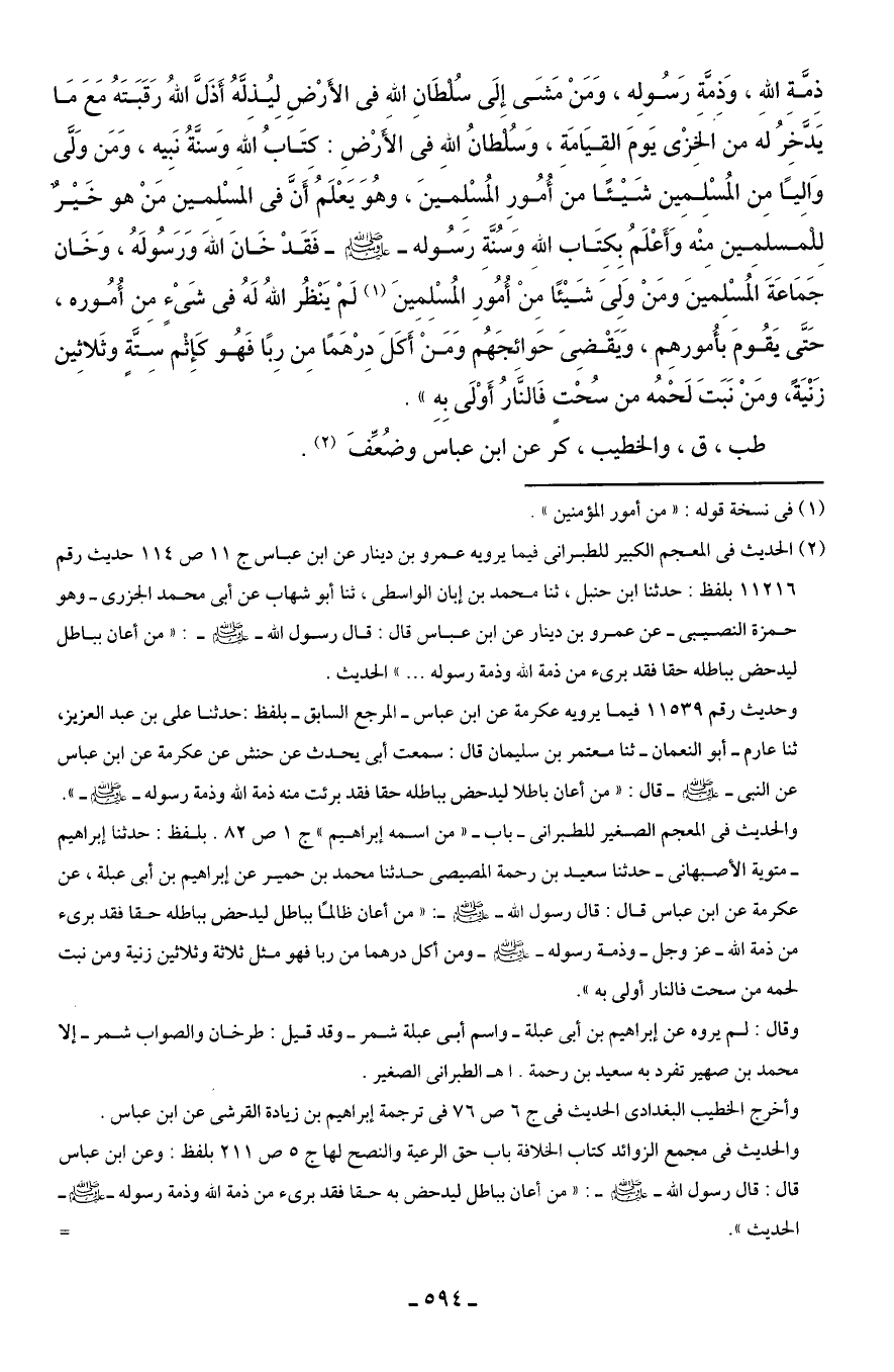 (¬2) الحديث في المعجم الكبير للطبرانى فيما يرويه عمرو بن دينار عن ابن عباس ج 11 ص 114 حديث رقم 11216 بلفظ: حدثنا ابن حنبل، ثنا محمد بن إبان الواسطى، ثنا أبو شهاب عن أبي محمد الجزرى -وهو حمزة النصيبى- عن عمرو بن دينار عن ابن عباس قال: قال رسول الله - صلى الله عليه وسلم -: "من أعان بباطل ليدحض بباطله حقا فقد برئ من ذمة الله وذمة رسوله ... " الحديث.