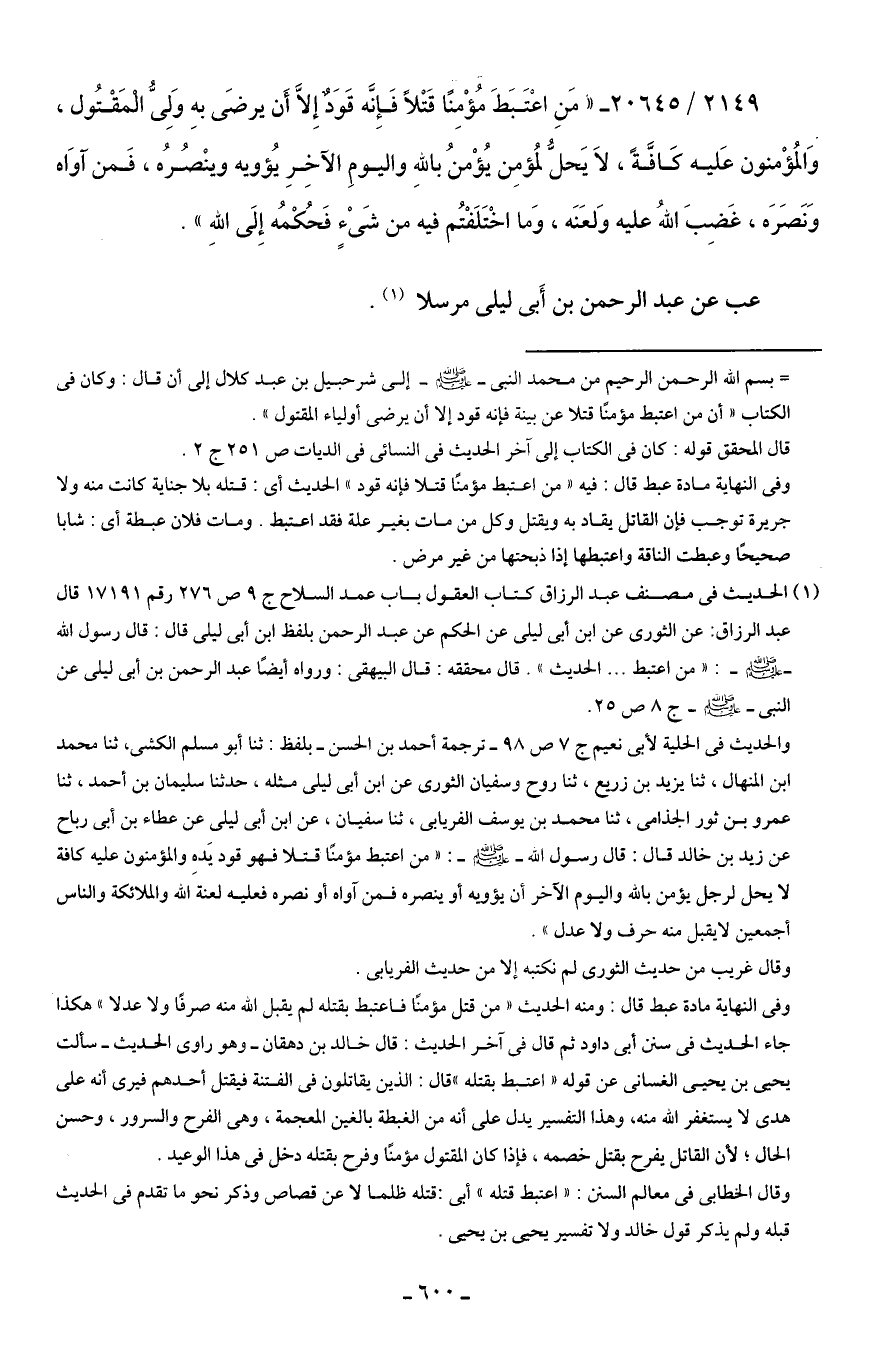 (¬1) الحديث في مصنف عبد الرزاق كتاب العقول باب عمد السلاح ج 9 ص 276 رقم 17191 قال عبد الرزاق: عن الثوري عن ابن أبي ليلى عن الحكم عن عبد الرحمن بلفظ ابن أبي ليلى قال: قال رسول الله - صلى الله عليه وسلم -: "من اعتبط ... الحديث". قال محققه: قال البيهقي: ورواه أيضًا عبد الرحمن بن أبي ليلى عن النبي - صلى الله عليه وسلم - ج 8 ص 25.